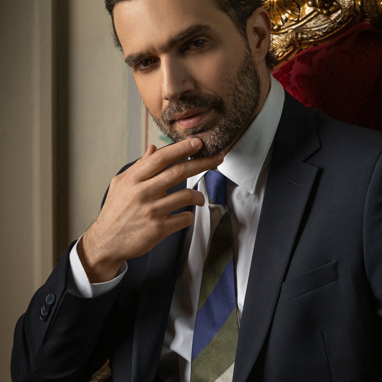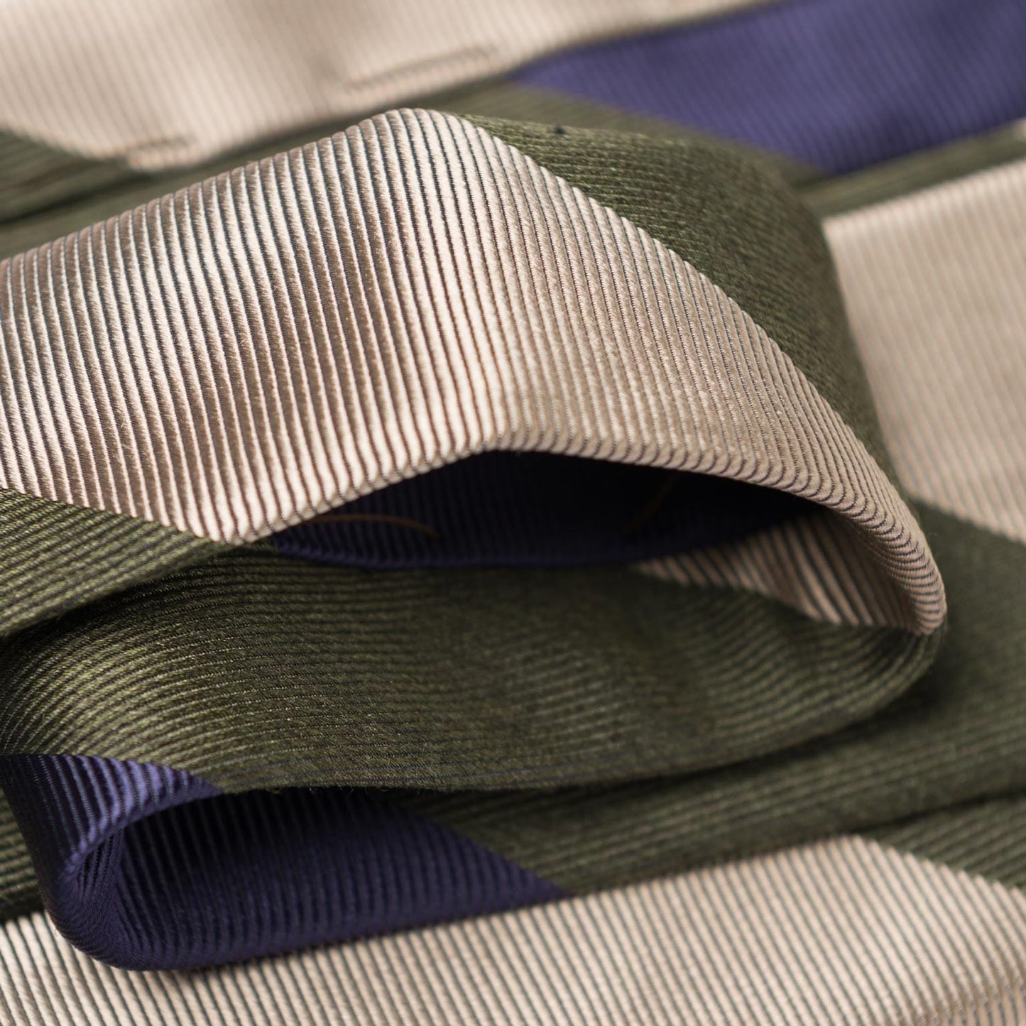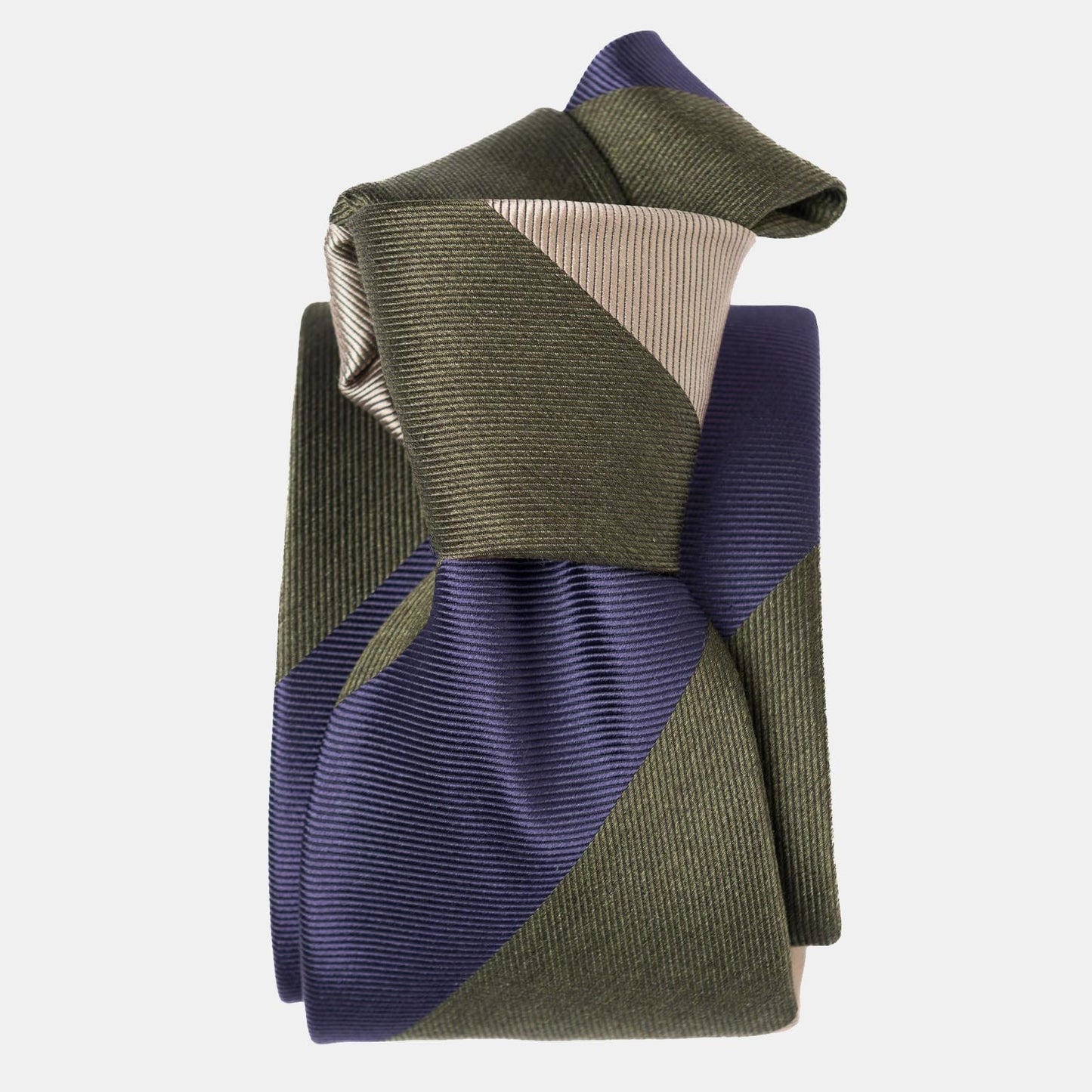 Our wide-striped tie brings timeless sophistication to any gentleman's wardrobe. The woven stripes combine classic sage green, navy and cream, offering a touch of effortless elegance and versatility. It's a must-have for any well-dressed man looking to stand out with refined style.