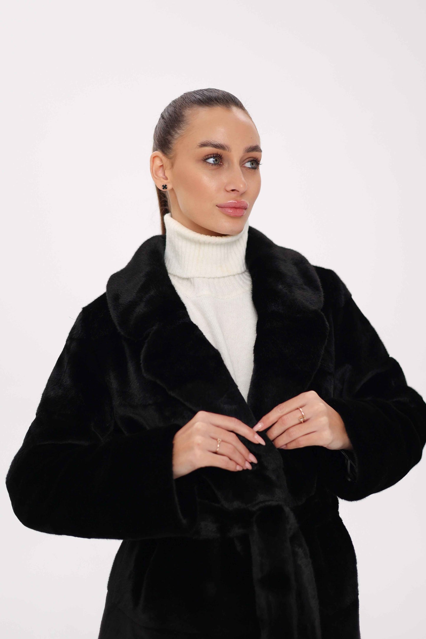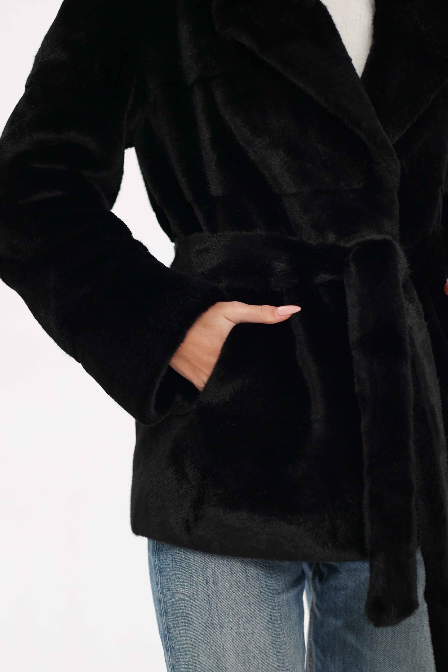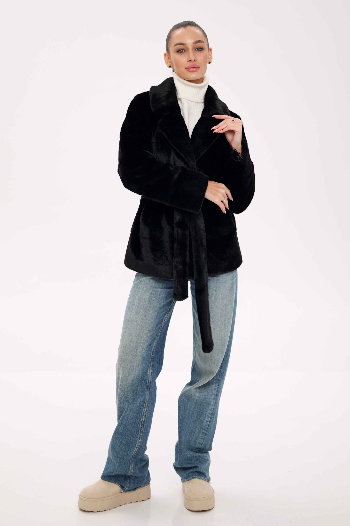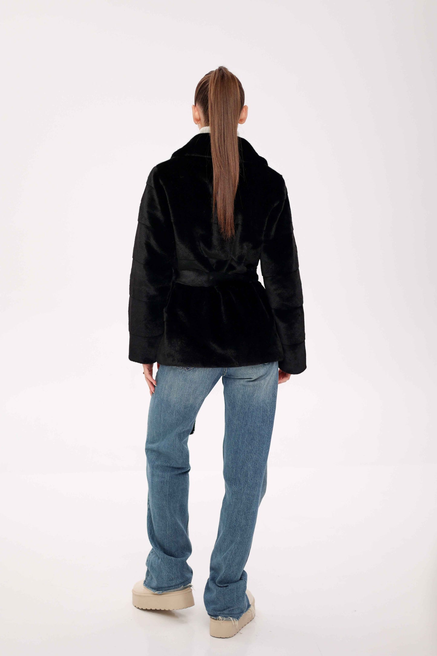 This luxurious faux fur short coat is the ultimate statement of modern elegance. Crafted in a rich black hue, it features a plush, velvety texture and a tailored fit enhanced by a classic notched collar and a self-tie belt to cinch the waist. The short design provides a contemporary twist, ensuring both warmth and sophistication, perfect for elevating your cold-weather wardrobe.