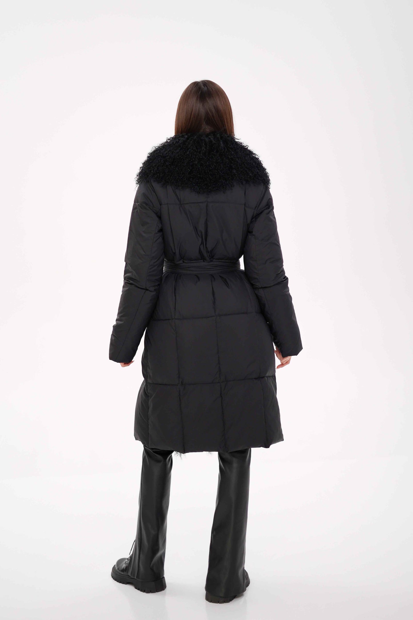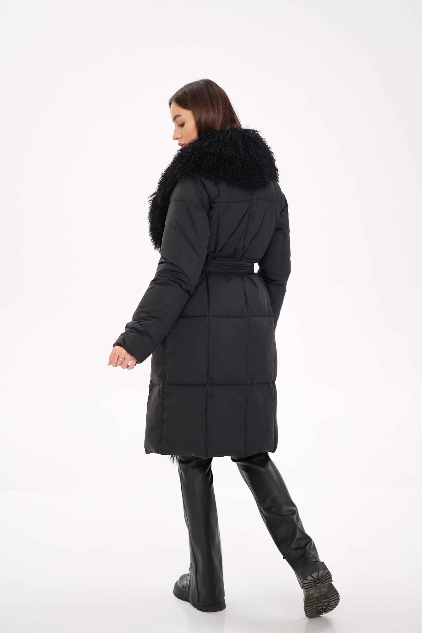 Luxurious white goose down insulated, elevated with quilt design, this coat is framed with a genuine Lama fur trim, delivering a sophisticated winter look with a feminine silhouette and luxury details.