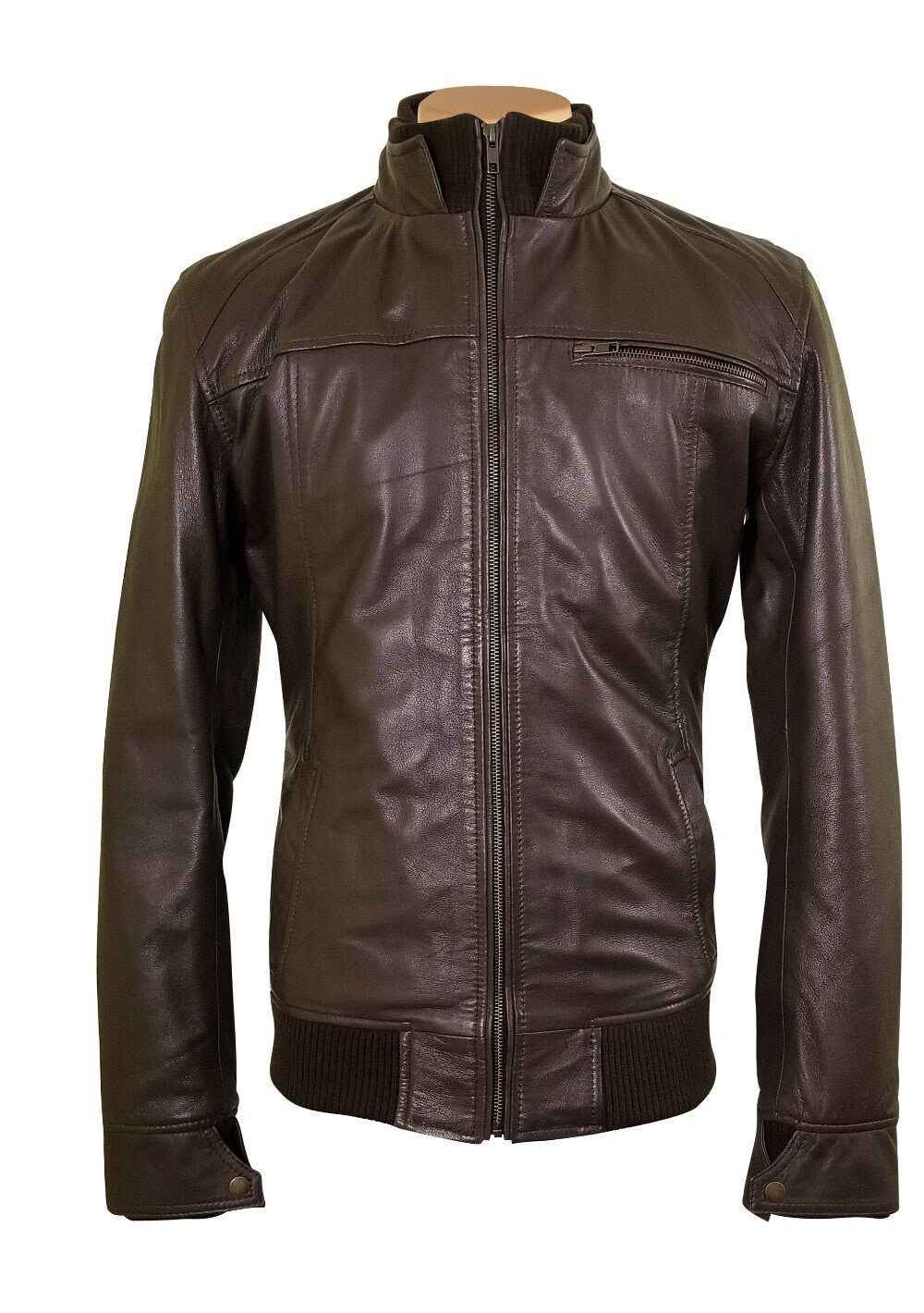 Handmade Brown Leather Jacket With Straight Ribbed Collar, Cuffs And Hem