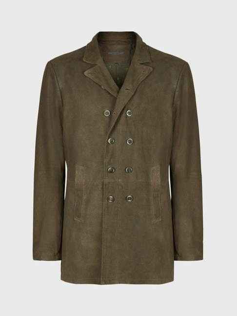 A lighter jacket for when you’re in between seasons. Double breasted with a peak lapel, this mid-length jacket features a burnished finish and welt pockets at the hip.