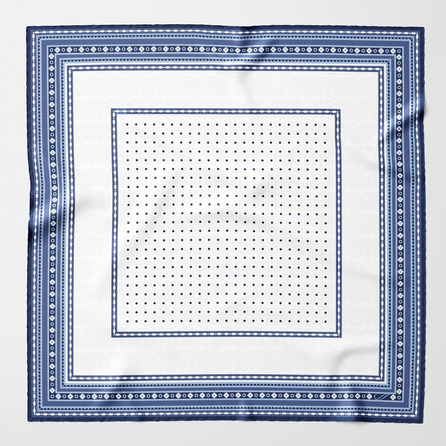 I paired this timeless polka dot pattern with a distinctive geometric border, carefully selecting a slightly off-white shade to ensure it complements all white shirts beautifully.